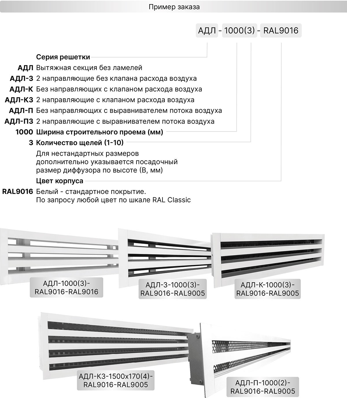 Щелевой диффузор АДЛ представляет собой вытяжную секцию без ламелей и без клапана расхода воздуха с высоким коэффициентом живого сечения. Относительно других моделей решеток этой серии, АДЛ имеет небольшой вес и более низкую стоимость. Могут быть самостоятельным изделием в виде одиночной секции или ее составной частью. После монтажа рамка решетки остается видимой, закрывая проем. Возможное количество щелей от 1 до 10.